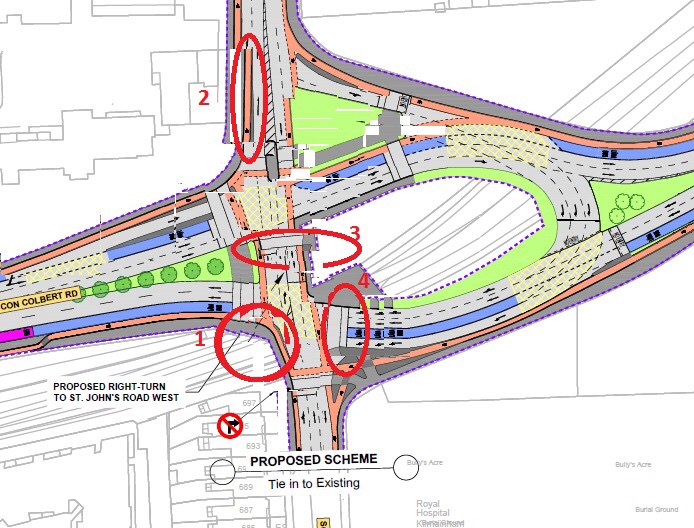 Traffic leaving this junction will be caught in the existing bottlenecks at Heuston Station, Sarah Bridge in Islandbridge and at the Richmond Gate/Kilmainham Jail. There is no advantage in more than one lane of general traffic leaving the junction northwards, southwards or eastwards, as the tailbacks from these bottlenecks already have traffic backed up. I would suggest that it would be preferable to queue this traffic on the Con Colbert Road dual carriageway itself, to reduce pressure on the bottleneck areas, as the impact on journey times would be neutral.