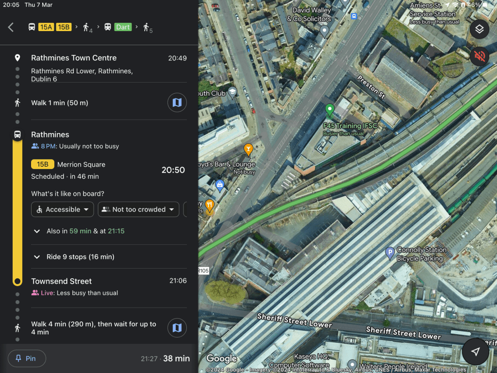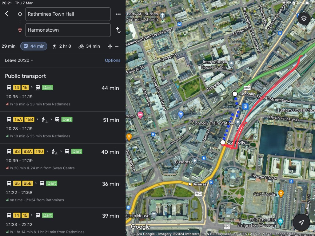 Travelling from Rathmines and trying to catch a DART is less of a smooth transition. You can take a 15 to Amiens Street, but you then have to cross the street and enter the main railway station and walk the full length of the platforms (as shown in the red line below) – Google Maps gets this wrong: