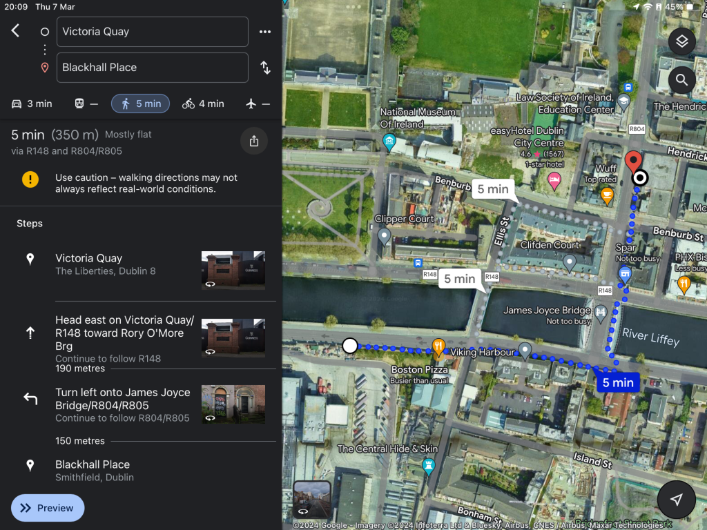Trying to get a bus from the west to go to to the northwest of the city leads you to the messy interchange shown below, where you are likely to be still on the first bus while you see the one that you want sail by on the other side of the Liffey! In reality, as you can see from the second screengrab, this is not the most efficient way of switching, although the position of bus stops here means that you have a 5 minute walk with the crossing of 4 roads. The switch can be more efficient the other direction, but bus stop positions are still not optimal: